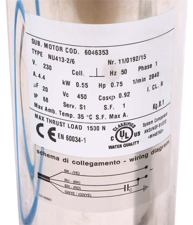 - Комплектующие: гидравлическая часть в полном сборе с электродвигателем; Кабель электропитания 1.5/1.75/2.5/4.0 м с разрешением к применению в питьевом водоснабжении (поперечное сечение: 4 x 1.5 мм2); В однофазном исполнении вкл. распределительные пусковые устройства с конденсатором, термическим реле электродвигателя, а также включателем/выключателем; Инструкция по монтажу и эксплуатации