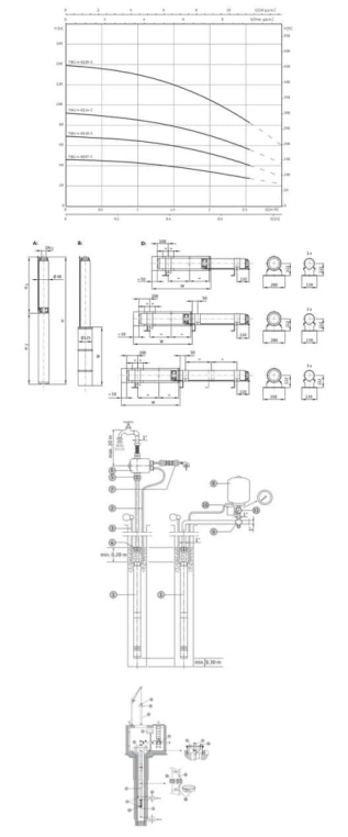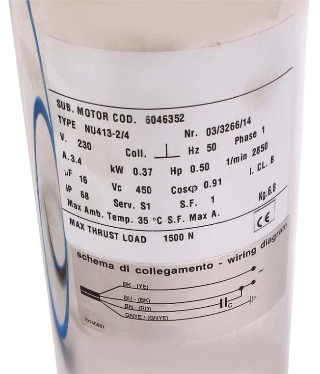 - Оснащение: многоступенчатый погружной насос с радиальными рабочими колесами; Встроенный обратный клапан; Муфта в соответствии с NEMA; Однофазный или трехфазный электродвигатель; Термическое реле электродвигателя для однофазного электродвигателя