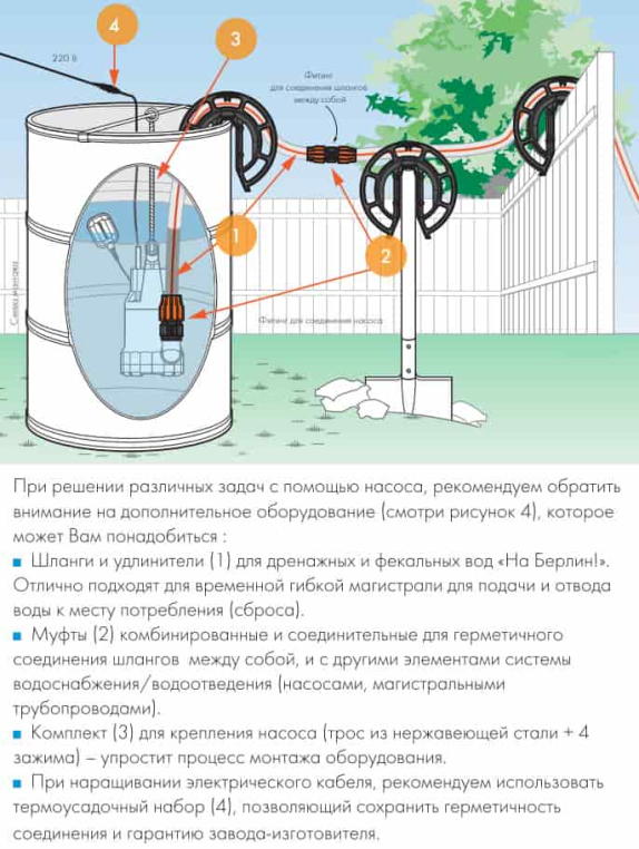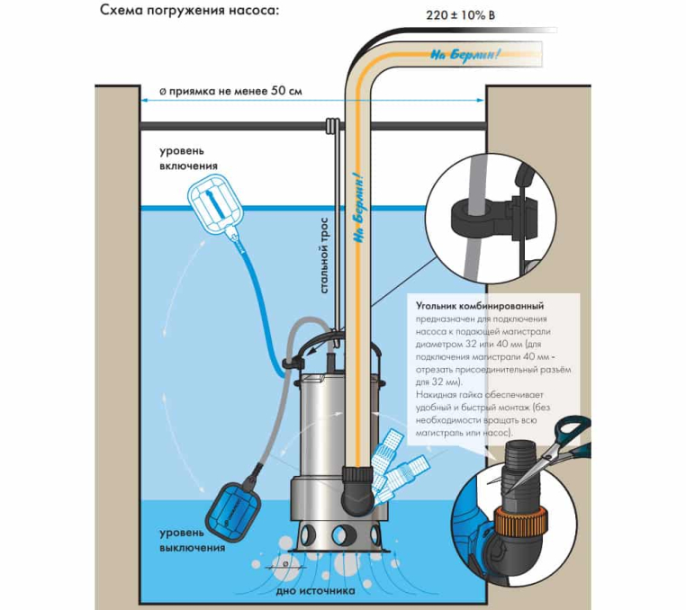 Насос «Фекальник» оснащен поплавковым выключателем, который запускает автоматический режим работы прибора: уровень включения/выключения насоса регулируется изменением вылета поплавкового выключателя относительно места крепления его кабеля на рукоятке прибора. Максимальная температура перекачиваемой жидкости – до +35 оС, максимальная глубина погружения – до 8 метров. Корпус насоса выполняется из нержавеющей стали. В комплекте с насосом поставляется силовой кабель для подключения различной длины (в зависимости от модели).