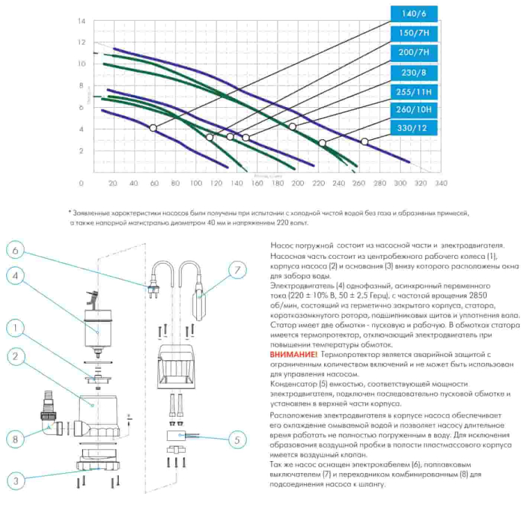 Погружной насос состоит из насосной части и электродвигателя. Насосная часть представляет собой центробежное рабочее колесо, корпус насоса и основание в нижней части корпуса, внизу которого расположены «окна» для забора воды. Однофазный асинхронный электродвигатель имеет частоту вращения 2850 об/мин и состоит из герметичного корпуса, статора, короткозамкнутного ротора, подшипниковых щитов и уплотнения вала. Статор имеет две обмотки: пусковую и рабочую. В обмотках статора имеется термопротектор, который отключает электродвигатель при повышении температуры обмоток. Конденсатор емкостью, соответствующей мощности электродвигателя, подключен последовательно пусковой обмотке и установлен в верхней части корпуса.