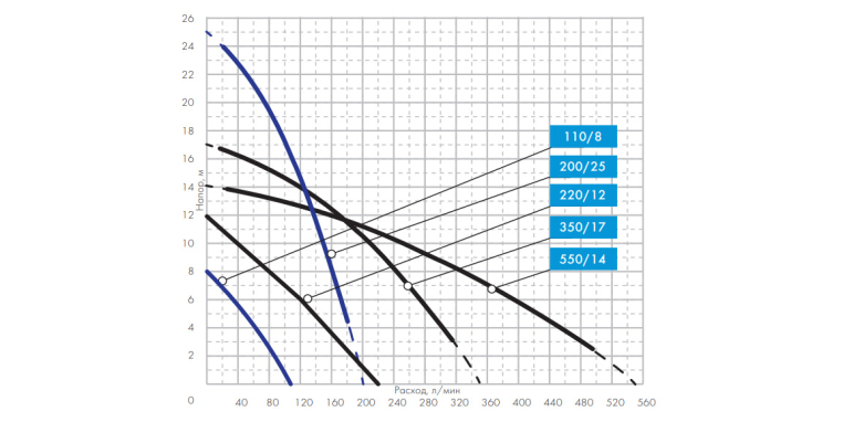 - Диаметр напорного патрубка: G 1" (25) – 1"1/4 (32) – 1"1/2 (40)