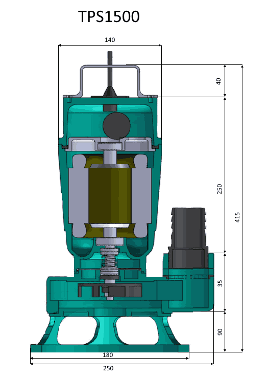 Насос дренажный Pumpman TPS1500A предназначен для откачивания чистой и слегка загрязненной воды из подвалов, резервуаров, емкостей. Насос оснащен режущим механизмом и подходит для перекачивания длинноволокнистых включений. Максимальный размер частиц для TPS 750 – 7 мм, для TPS1500 – 20 мм. Корпус насоса выполняется из чугуна и алюминия. Максимальная глубина погружения – до 7 метров. Электродвигатель оснащен защитой от перегрева, обмотка двигателя выполняется из 100% меди.