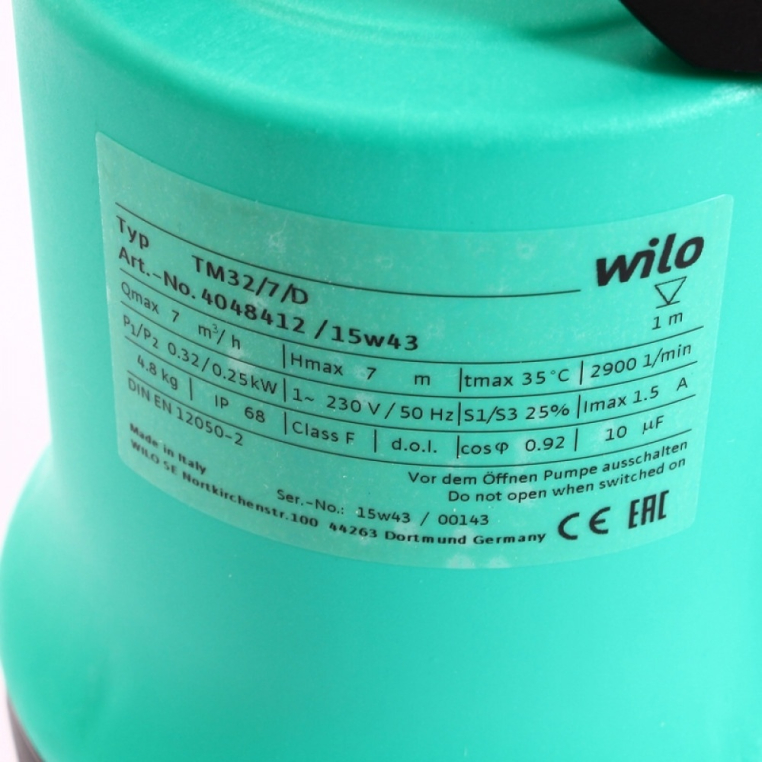- Комплектующие: насос с кабелем, штекером и встроенным поплавковым выключателем (кроме TM 32/8); прилагаемым обратным клапаном (не для TM 32/7 и TM 32/8-10M); Подсоединение шланга с внешней резьбой или штуцером (ø 35 мм); Инструкция по монтажу и эксплуатации