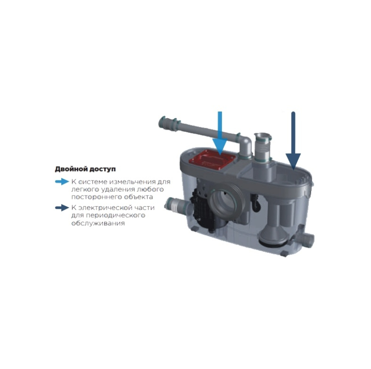 Принцип работы насоса Saniaccess 3 прост: после спуска воды и поднятия уровня воды в корпусе насос автоматически включается и начинает работать измельчитель в течение 3-4 секунд. Затем измельченные стоки удаляются и насос Saniaccess 3 снова готов к работе.