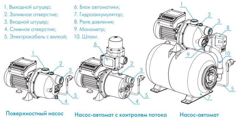 - Основными составляющими насоса-автомата являются центробежный насос со встроенным эжектором, встроенным регулирующим клапаном и блок автоматики