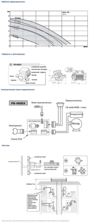 Насосы серии Wilo PB отличаются высокой эксплуатационной надежностью и защитой от «сухого хода», что обеспечивается встроенным выключателем со стороны напорного патрубка, срабатывающим при определенном расходе. Однофазный электродвигатель с непосредственным фланцевым соединением обладает встроенной защитой от перегрева, конденсатором и защитным выключателем. Насос поставляется без электрического кабеля и штекера. Насос выделяется очень низким уровнем шума при эксплуатации. Корпус насоса выполняется из серого чугуна, рабочее колесо – из пластика, вал – из нержавеющей стали, скользящее торцевое уплотнение – из графита и керамики. Насос имеет три режима работы: автоматический, ручной и выключение.