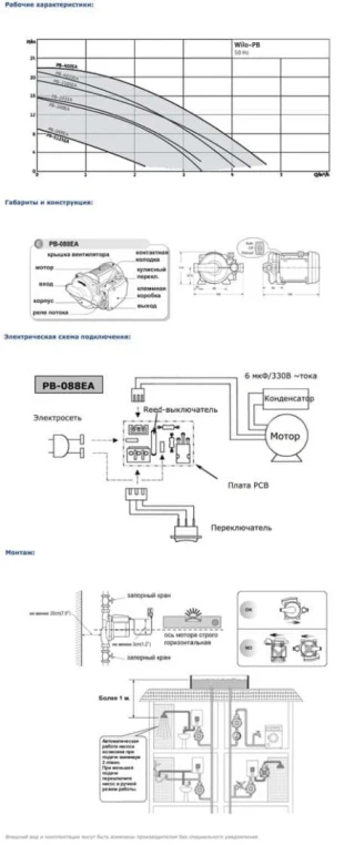 Насосы серии Wilo PB отличаются высокой эксплуатационной надежностью и защитой от «сухого хода», что обеспечивается встроенным выключателем со стороны напорного патрубка, срабатывающим при определенном расходе. Однофазный электродвигатель с непосредственным фланцевым соединением обладает встроенной защитой от перегрева, конденсатором и защитным выключателем. Насос поставляется без электрического кабеля и штекера. Насос выделяется очень низким уровнем шума при эксплуатации. Корпус насоса выполняется из серого чугуна, рабочее колесо – из пластика, вал – из нержавеющей стали, скользящее торцевое уплотнение – из графита и керамики. Насос имеет три режима работы: автоматический, ручной и выключение.