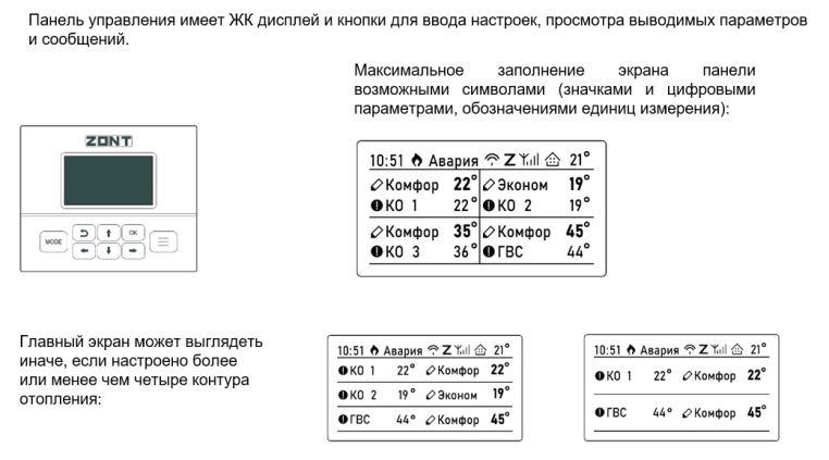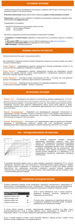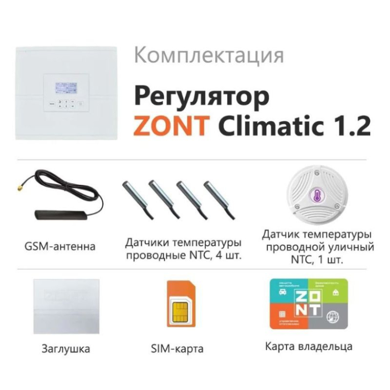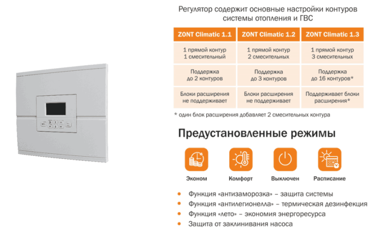 Регулятор систем отопления ZONT Climatic имеет возможность отправлять оповещения владельцу посредством: голосовых и SMS-сообщений, электронных писем и push-уведомлений. В комплект поставки входит SIM-карта. К устройству можно подключить до 55 датчиков, из которых 15 – проводных и 40 радиодатчиков. Регулятор имеет несколько предустановленных режимов: «Антизаморозка», «Антилегионела» (термическая дезинфекция), «Лето» (эконом-режим) и защита от заклинивания насоса.