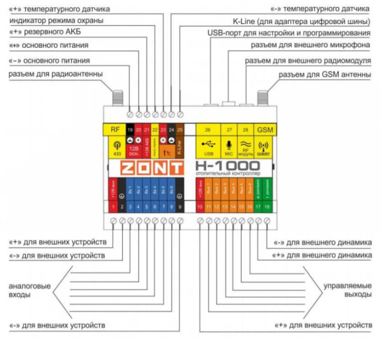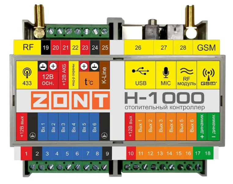 - Радиоканал: 433 MHz – встроенный, 868 MHz – через модуль ZONT МЛ-489