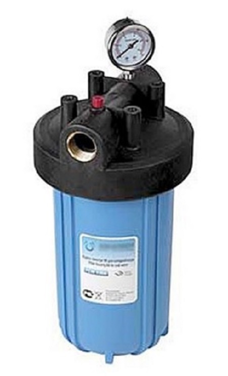 Корпус фильтра 10" Big Blue FH10 BB-BM (ключ, кронштейн, латунные вставки, манометр) синий. Фильтры серии устанавливаются для очистки больших протоков воды или если она сильно загрязнена. Корпус изготовлен из полипропилена повышенной прочности синего цвета с латунными резьбовыми присоединениями. На крышке находится манометр и клапан сброса избыточного давления.