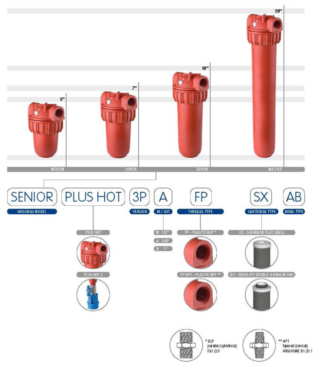 Колба фильтра 10" Atlas Filtri для горячей воды Plus Hot 1/2" 3P SX, BX представляет собой корпус для фильтрации и обработки горячей воды до 80 оС, совместимый с фильтрующими картриджами типа SX (DOE). Колбы выпускаются с пластмассовыми патрубками 1/2", 3/4" и 1" с цилиндрической резьбой СТР или 3/4", 1" с конической резьбой КТР. Корпусы Plus Hot 3P SX могут вмещать картриджи различной высоты от 5" до 20" и обеспечивать максимальное сопротивление благодаря материалу, из которого они изготовлены (армированный нейлон). Колбы фильтров горячей воды рассчитаны на рабочее давление до 8 бар. Выпускаются в матовом стакане красного цвета, конструкция состоит из трех частей. Колбу легко открывать/закрывать, в качестве уплотнения используется кольцо