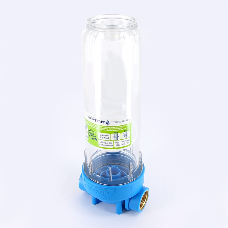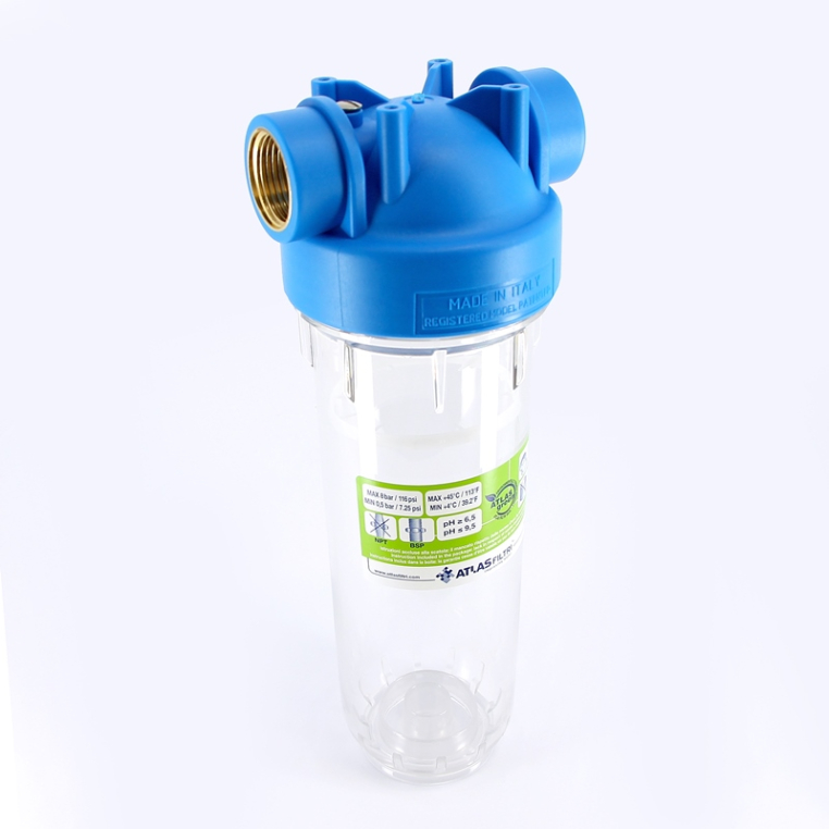 Колба фильтра 10" Atlas Filtri DP Mono 1" 2P SX, BX представляет собой корпус для фильтрации и обработки холодной воды до 45 оС, совместимый как с картриджами SX со стандартными плоскими прокладками (DOE), так и со специальными картриджами BX с быстроразъемным соединением и двойным уплотнительным кольцом. Правильное расположение картриджей SX обеспечивается с помощью системы центрирования Filter-Fit. Одинарная колба фильтра рассчитана на одностадийную обработку воды. Водяные фильтры DP доступны с прозрачными или матовыми стаканами (белого или синего цвета), которые варьируются в зависимости от желаемой высоты картриджа от 5" до 20". Колбы фильтров холодной воды рассчитаны на рабочее давление до 8 бар