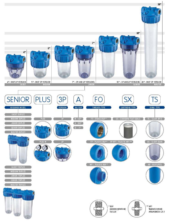 Колба фильтра 10" Atlas Filtri Plus 1" 3P SX представляет собой корпус для фильтрации и обработки холодной воды до 45 оС, совместимый со стандартными фильтрующими картриджами типа SX (DOE). Фильтры выпускаются в одиночной, двойной (Duplex) и тройной (Triplex) версии, с прозрачным или матовым стаканом. Доступны латунные патрубки 1/2", 3/4" и 1" с резьбой СТР или с пластиковой резьбой СТР или КТР. Корпуса PLUS 3P SX можно использоваться с картриджами различной высоты от 5" до 20". Картриджные фильтры PLUS 3P SX обеспечивают превосходную производительность с точки зрения безопасности и легкую и быструю установку. Колбы фильтров холодной воды рассчитаны на рабочее давление до 8 бар