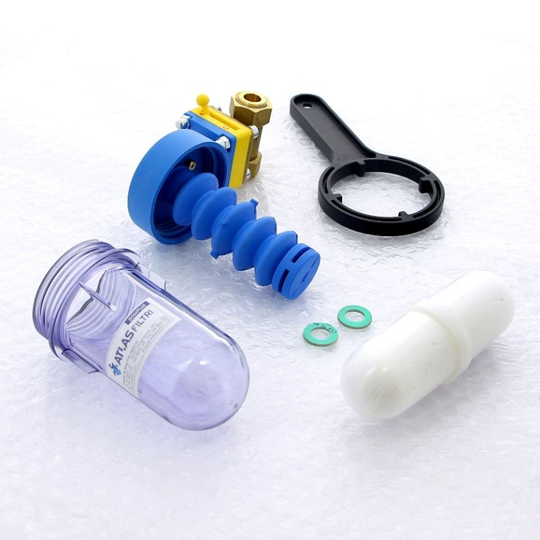 Дозатор Atlas Filtri DosaPlus 3 пропорциональный с готовым к применению зарядом полифосфата подходит для защиты от накипи и антикоррозийной обработки питьевой воды для бытовых и промышленных целей. Посредством автоматического и пропорционального дозирования готового к использованию полифосфата Poliphos (продукта для борьбы с накипью и коррозией) пропорциональная система дозирования Dosaplus выпускает полифосфаты, которые при растворении в воде оказывают кондиционирующий эффект на карбонаты, не позволяя им осаждаться на трубы и нагреватели. Система оснащена патрубком, который вращается на 360 градусов для простоты подсоединения к горизонтальным и вертикальным трубам. Пропорциональные системы дозирования Atlas Filtri оснащены специальным всасывающим устройством, которое посредством эффекта Вентури позволяет дозировать в поток определенное количество полифосфатов, заданное стандартами для использования воды в качестве питьевой. Каждая модель оснащена запчастями и аксессуарами для установки.