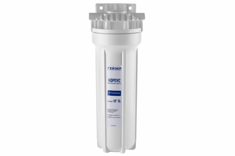 Корпус Гейзер 10SL изготовлен из белого полипропилена с латунными вставками и пластмассовой скобой . Корпус рассчитан на работу под давлением и установку на входе в систему холодного водоснабжения. В производстве корпусов используется материалы пищевого класса.