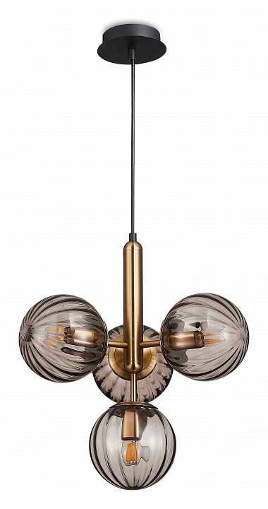 Подвес с черной потолочной чашей и черным проводом, металлическим продолговатым элементом цвета бронзы и 4-мя плафонами из дымчатого стекла. D310mm, H500-1900mm, 4хЕ27