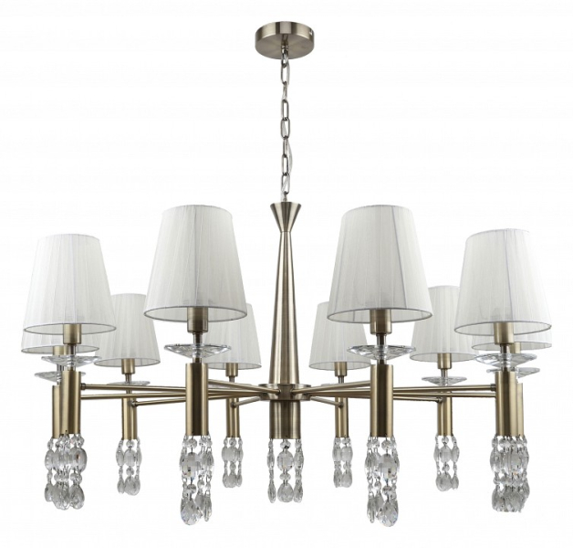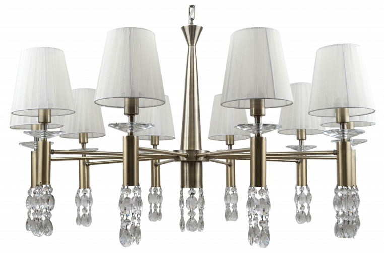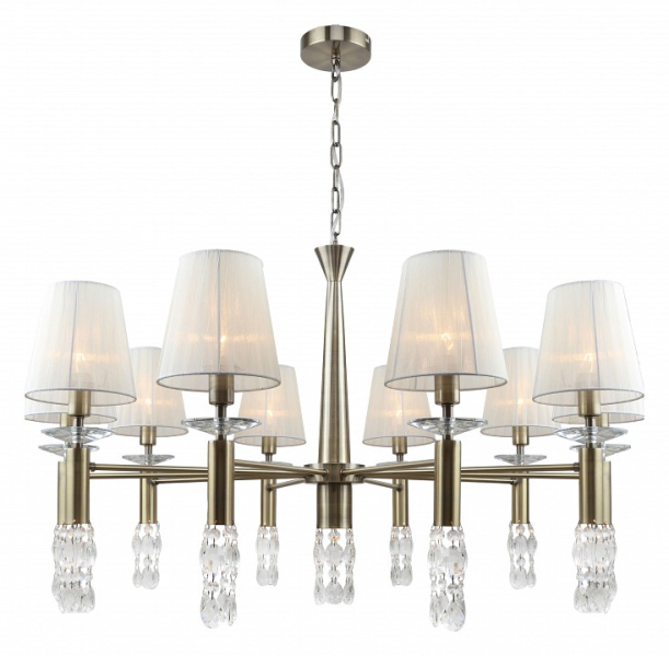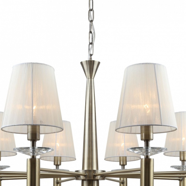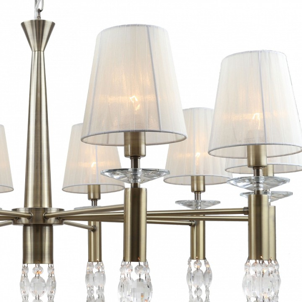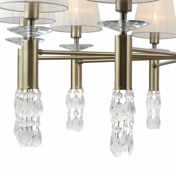 каркас цвета античная бронза, абажуры из полупрозрачной бежевой ленты, хрусталь высшего качества, дополнительный источник света G9 в нижней части рожков и центрального штока