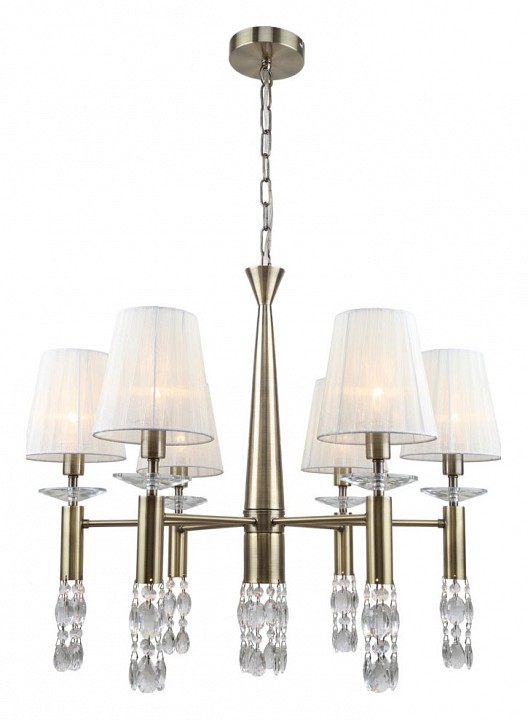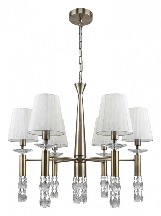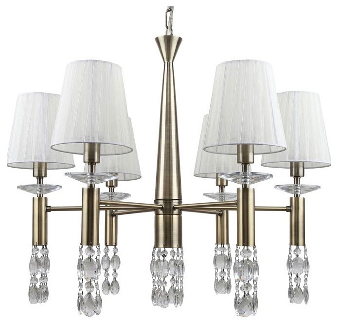 каркас цвета античная бронза, абажуры из полупрозрачной бежевой ленты, хрусталь высшего качества, дополнительный источник света G9 в нижней части рожков и центрального штока