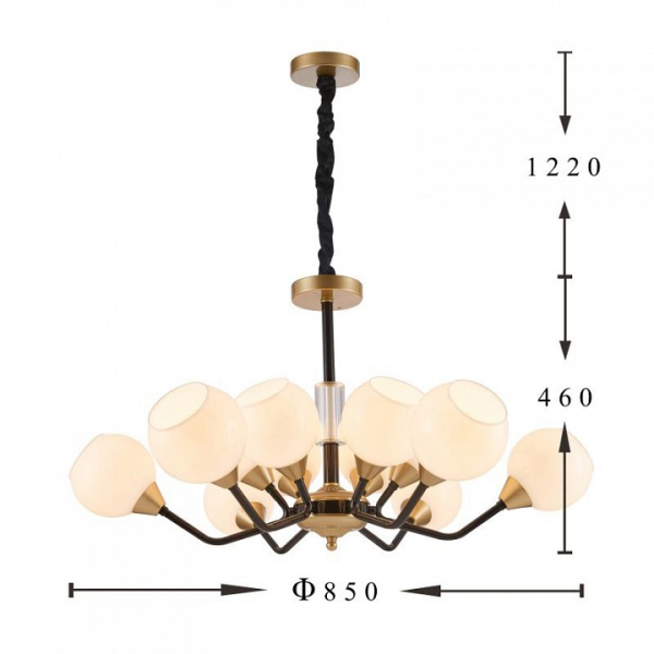 каркас цвета черный и золотой, плафоны из молочного стекла, декоративные элементы из прозрачного стекла