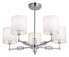 Люстра из металла цвета хром с белыми текстильными абажурами и минималистичными стеклянными элементами. 5хЕ14