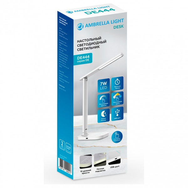 Изделие DE444 от российского бренда Ambrella light относится к коллекции Desk и отлично подойдет для установки на стол офиса, оформленном в стиле хай-тек. Осветительный элемент встроен в конструкцию и не требует приобретения дополнительных лампочек. Основным материалом для производства используется пластик. Преимущественно представляется в цвете Белый.